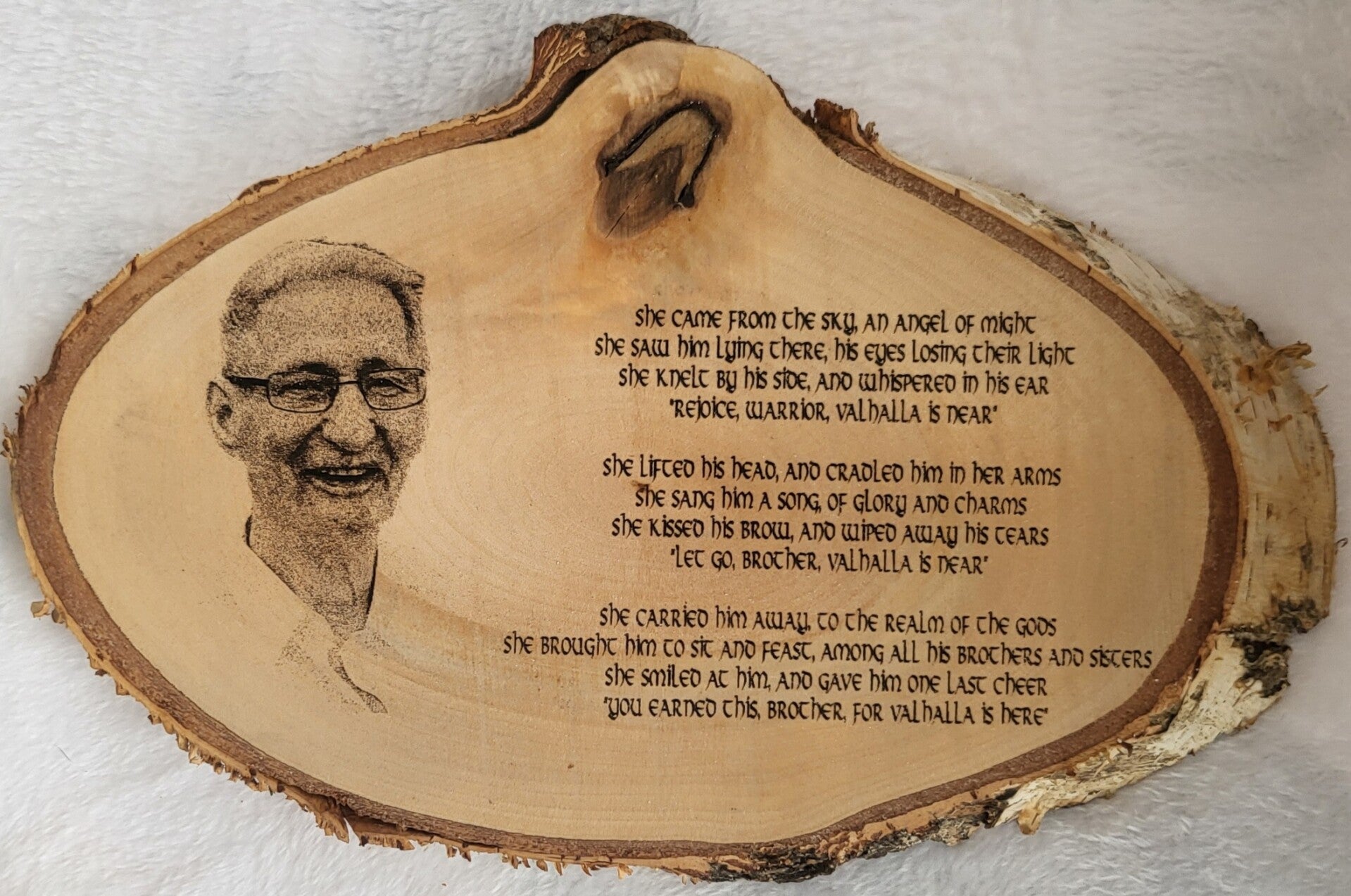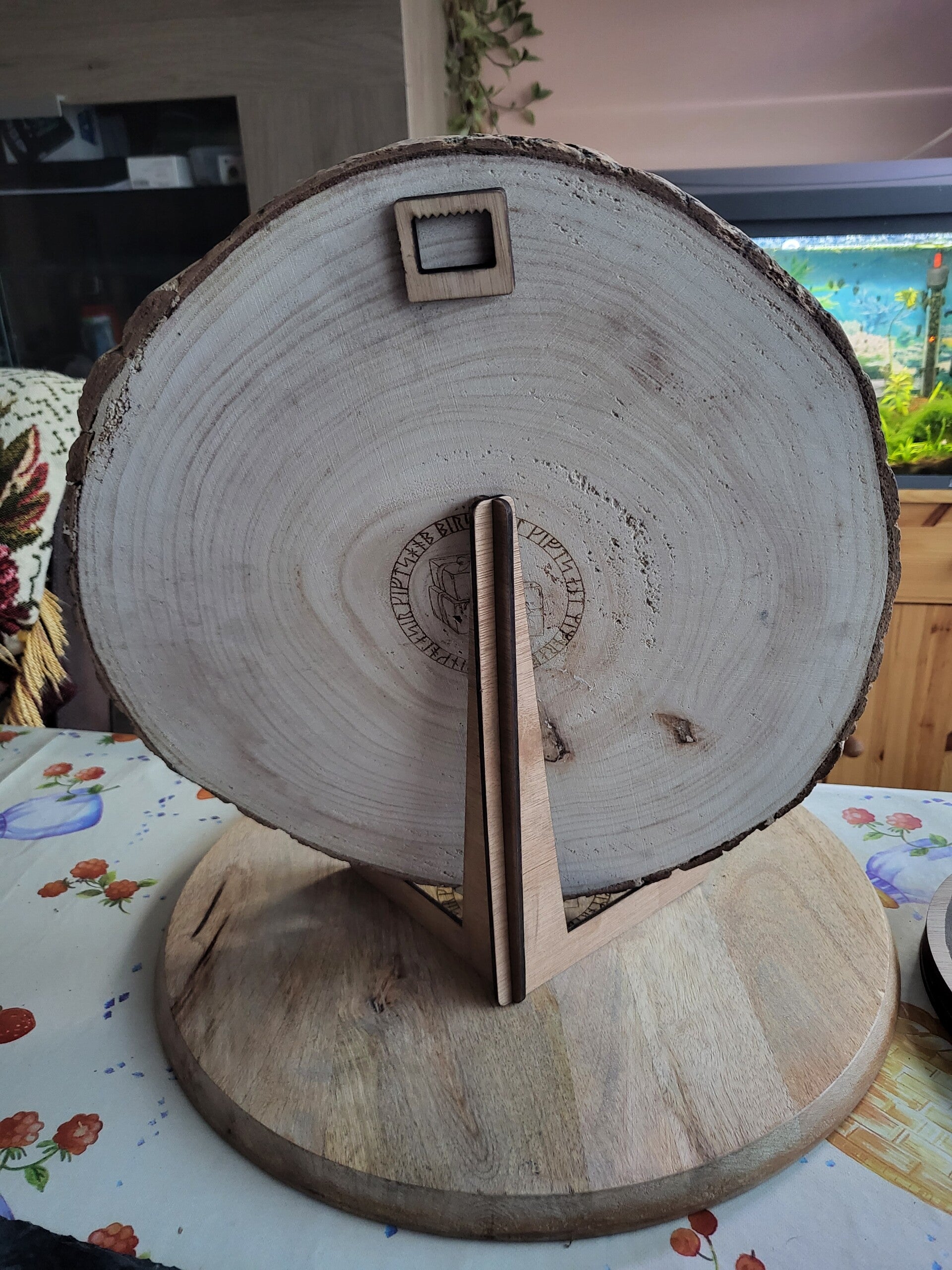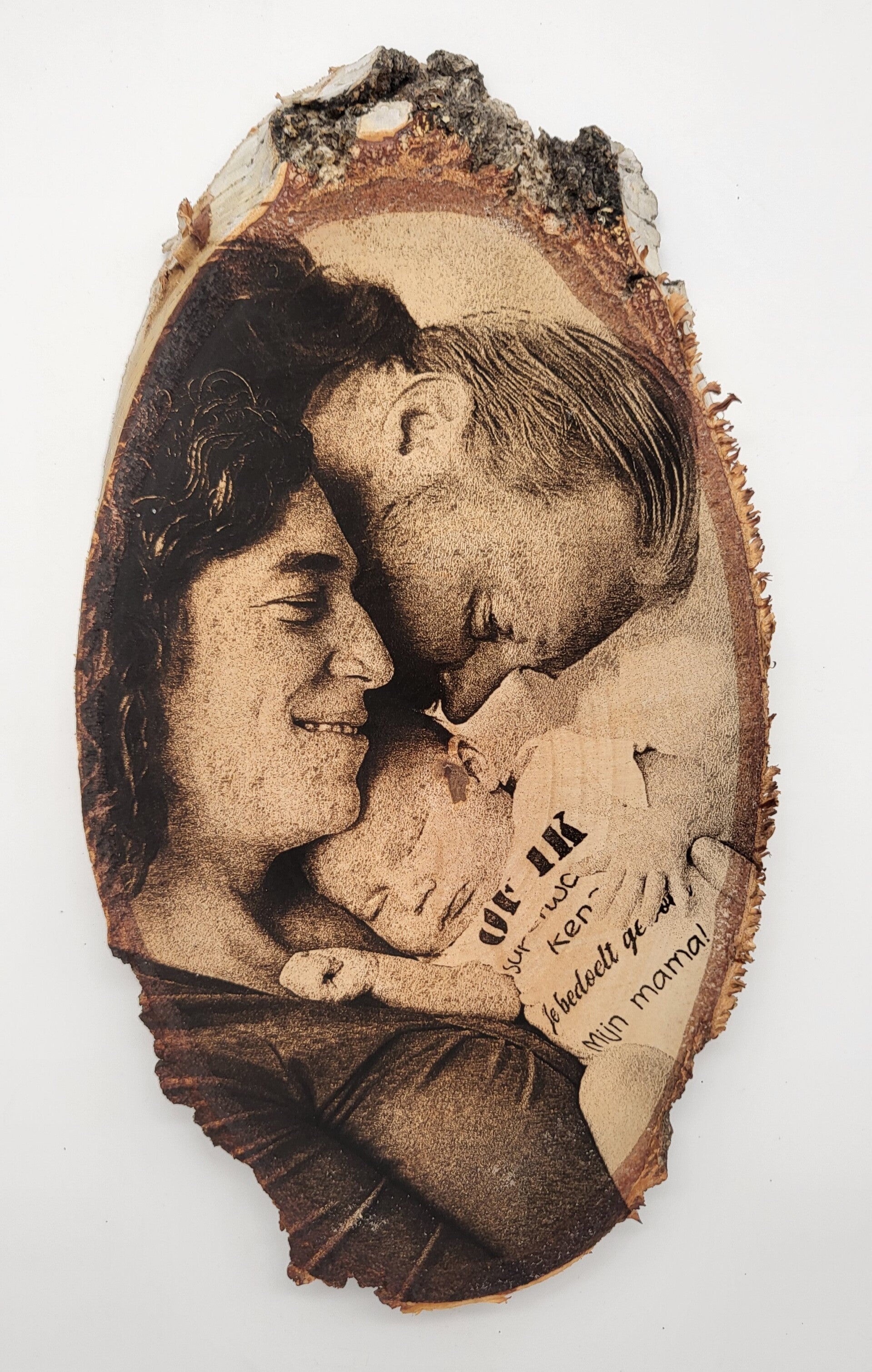 Lasergravering naar keuze op een boomschijf: afbeelding of foto, tekst of een combinatie van beiden. Keuze uit Ronde boomschijf van ongeveer 32cm diameter of een Ovale boomschijf van ongeveer 16x24cm.