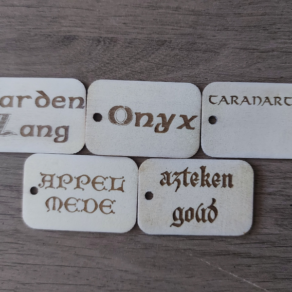 Houten naamplaatjes van maximum 5x5 cm of eigen aangepaste afmeting zoals in foto's 1 en 2.