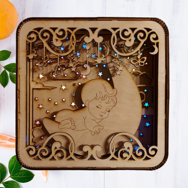 Lasergesneden houten lichtbak. Deze lichtbak is voornamelijk bedoeld als nachtlamp voor in een babykamer. Deze lichtbak heeft een standaard centrale afbeelding (niet aanpasbaar). Er kan wel een naam in de halve maan gelaserd worden.