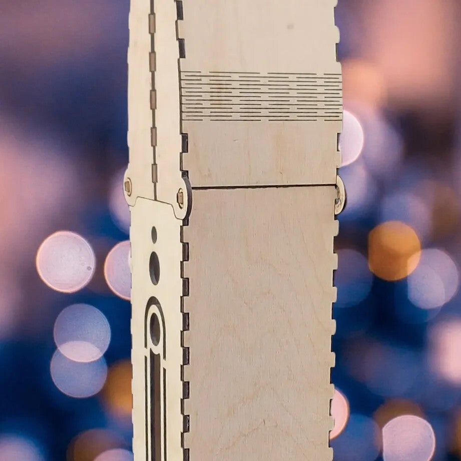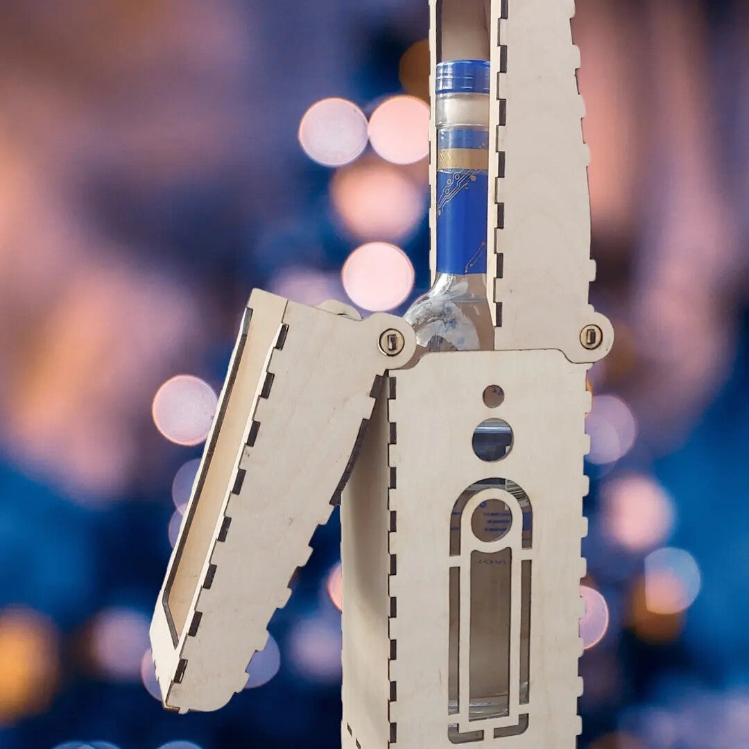 Type 1: Geschenkdoos voor fles sterke drank (in foto vodkafles): bevat handvat. Elke vrije zijde (de beide zijkanten) kan gelaserd worden met een naam, afbeelding of tekst. Afmetingen: 41 x 9,5 x 9,5 cm.