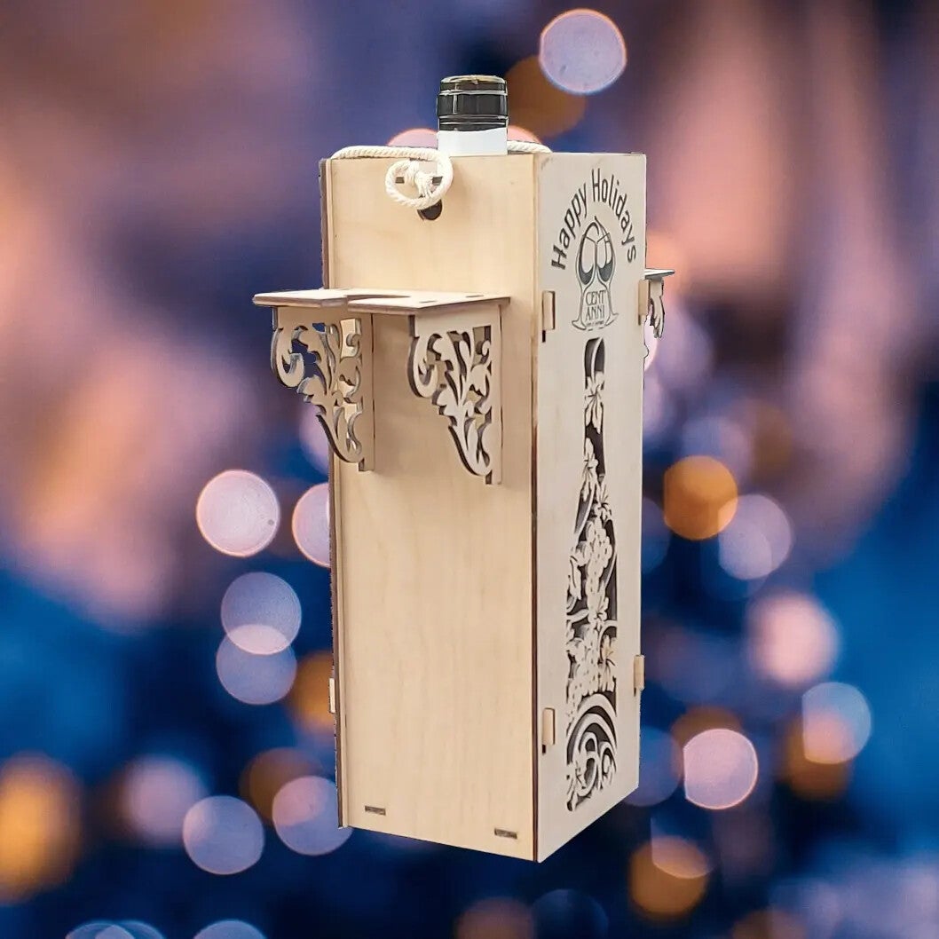 Type 2: Geschenkdoos voor wijnfles of fles mede: Afbeelding op deksel kan aangepast worden door een naam, afbeelding of tekst. Ook de zijde daar net onder kan nog gelaserd worden met een afbeelding, tekst, naam of logo. Afmetingen: 32,5 x 9,5 x 9,5 cm.