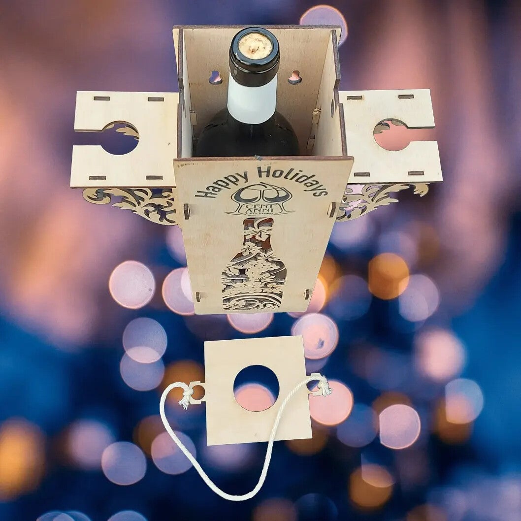 Type 3: Geschenkdoos voor wijnfles en 2 glazen: De centrale uitsnijding vooraan kan weggelaten worden en logo en tekst kunnen aangepast worden. Voor- en achterkant kunnen gelaserd worden met een afbeelding, logo, naam of tekst naar keuze. Afmetingen: 27,6 x 9,6 x 10,5.