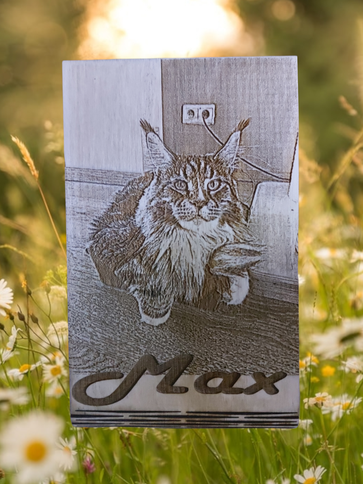 Lasergesneden staander bedoeld als memorabilia: Je kan een foto uploaden van de persoon of het dier dat je wil vereeuwigen in een gravure. De naam kan er eveneens bij. Afmetingen: 18 x 14 x 6 cm (staand); 14 x 18 x 6 cm (liggend).