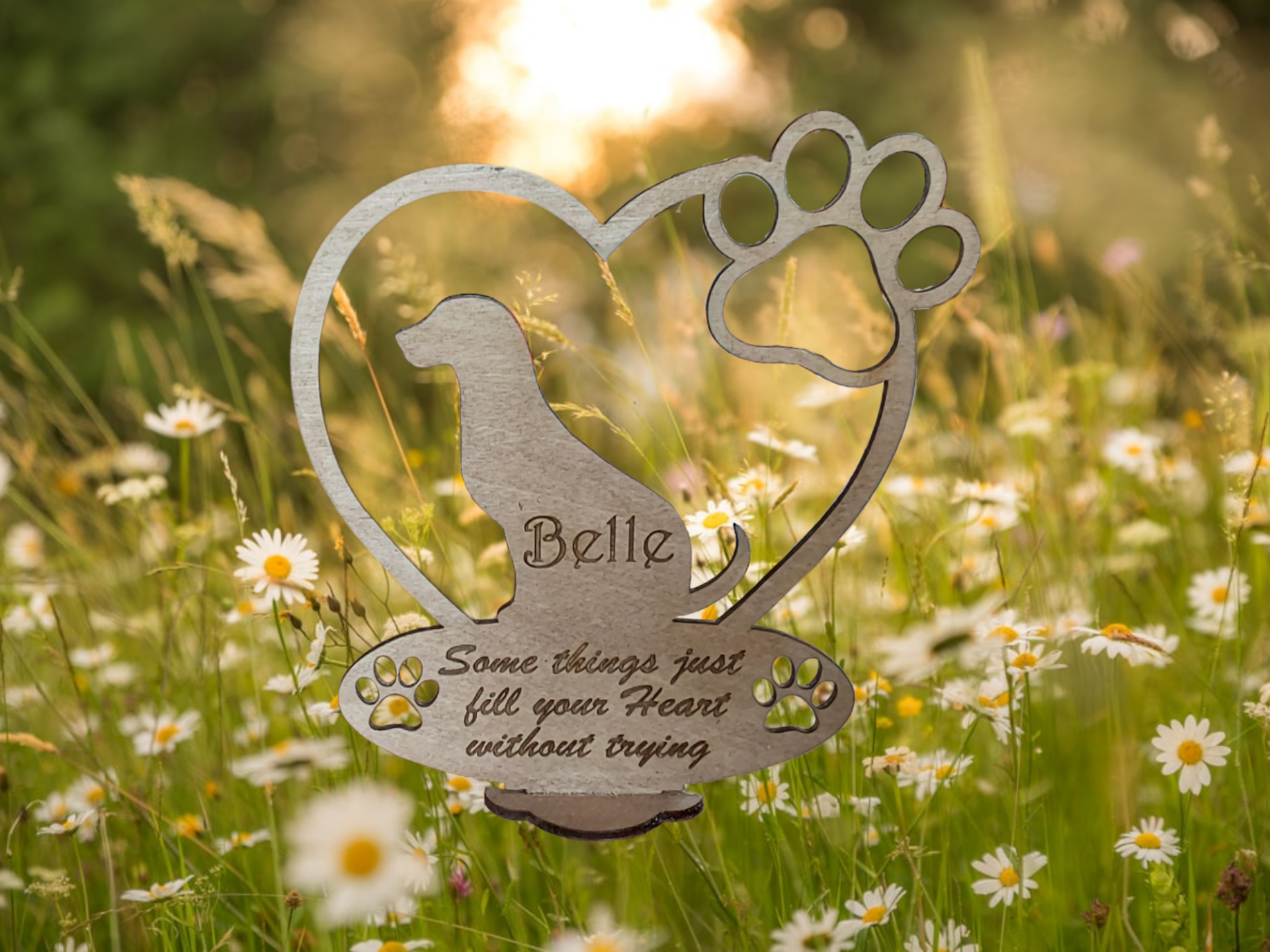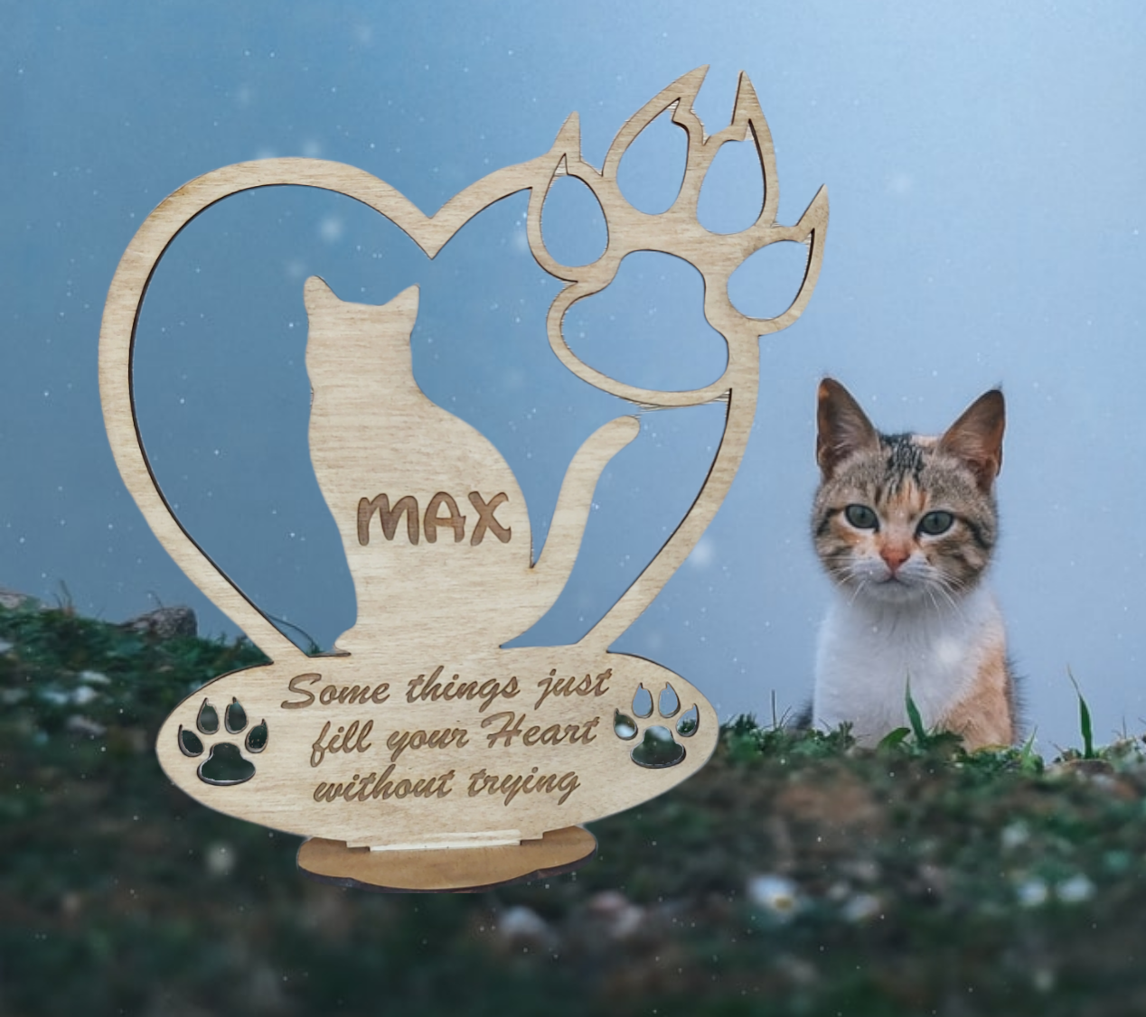 Uitgesneden staander voor hond/kat bedoeld als memorabilia: De naam van je huisdier kan erin gegraveerd worden alsook de data. Het zinnetje onderaan: oftewel het standaardzinnetje zoals op de foto's zijn, ofwel een eigen zinnetje. Afmetingen: 15 x 16 x 3,5 cm.