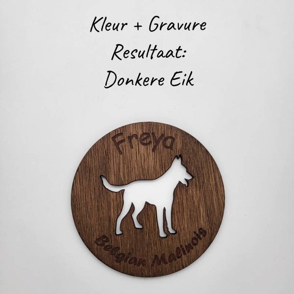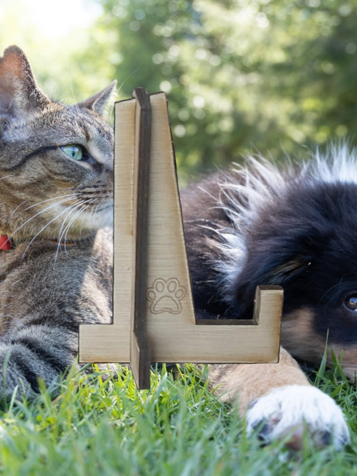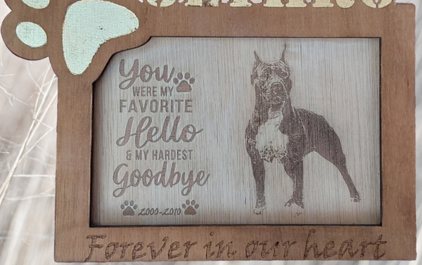 Houten fotokader met een gelaserde afbeelding. Inclusief een houten voetje om de fotokader in te zetten. Pootafdruk en titel kunnen nog afgewerkt worden met bladgoud.