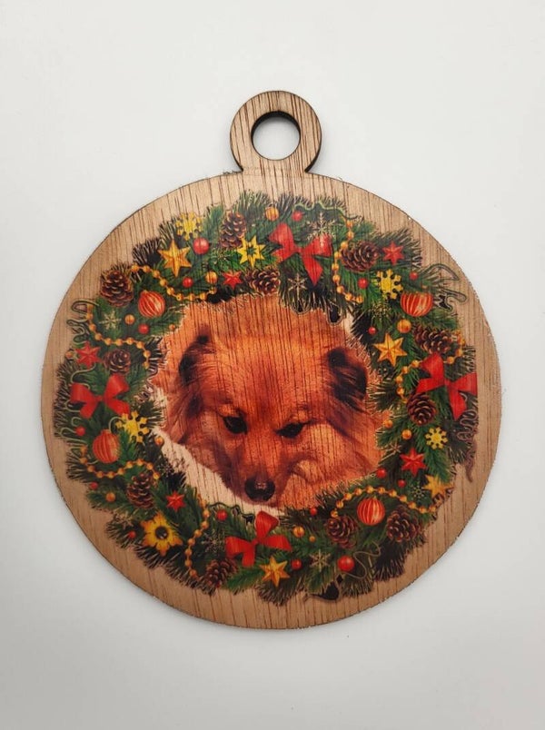 Houten kerstornament met gepersonaliseerde foto via sublimatie (kleurenprint). Komt per set van 4.