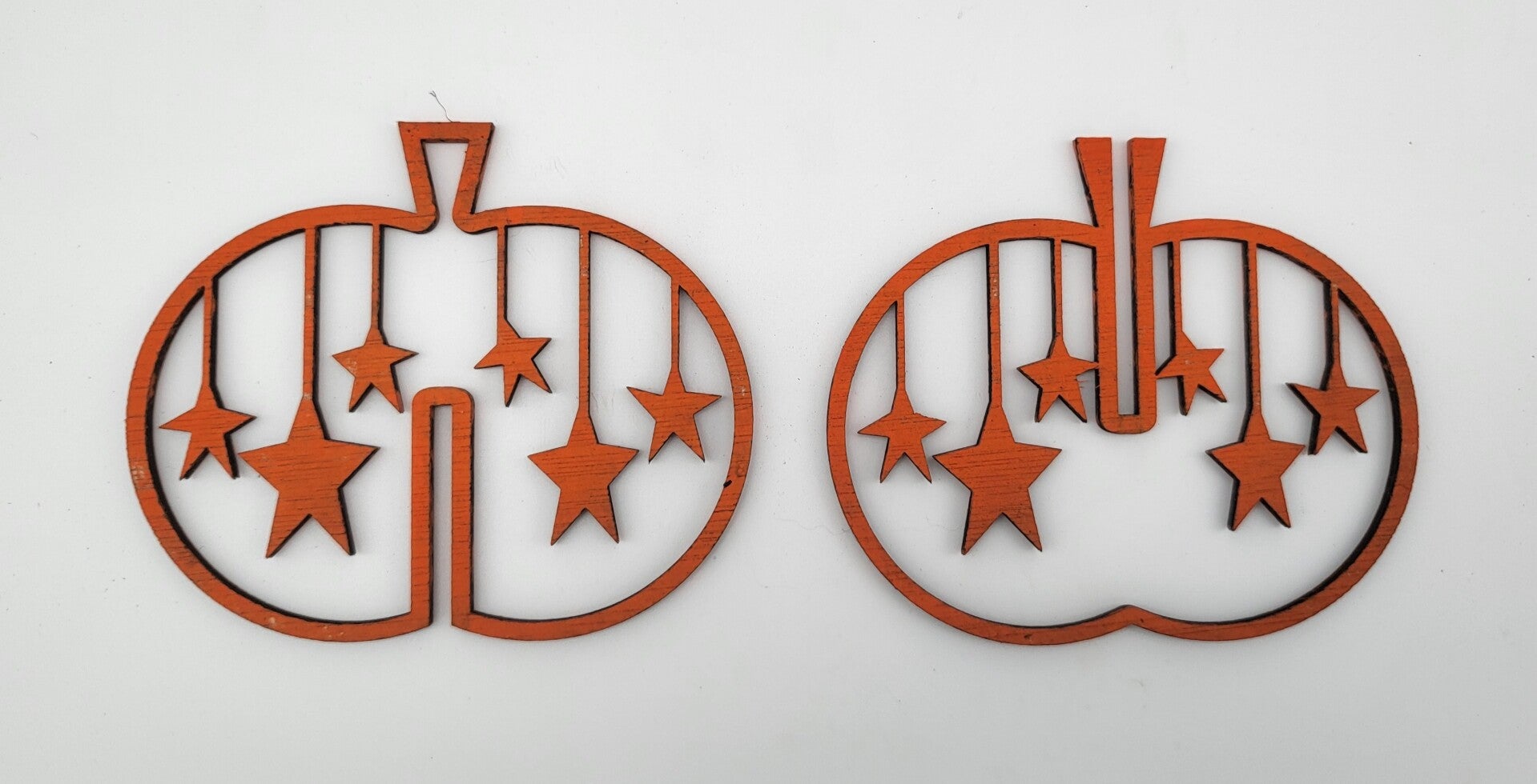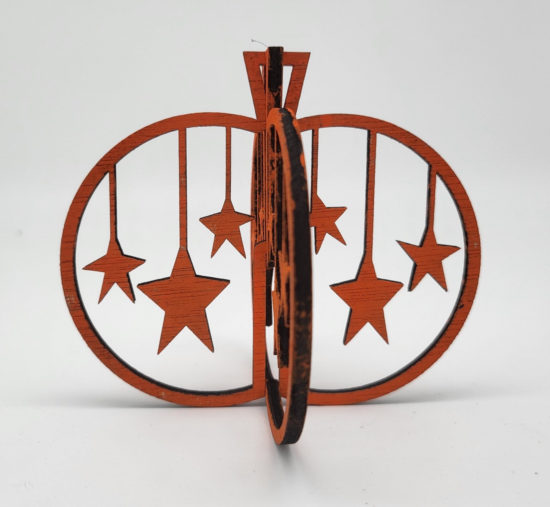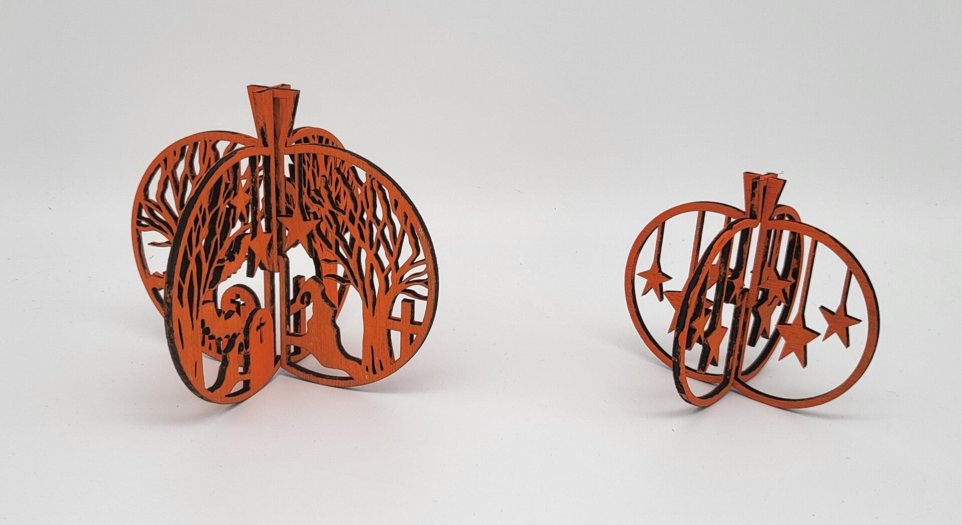 Pompoenen. Verschillende afmetingen en patronen. Kunnen met "visdraad" opgehangen worden of kunnen dienen als tafelversiering. Worden verstuurd in twee helften; klant moet de helften terug in elkaar schuiven.
