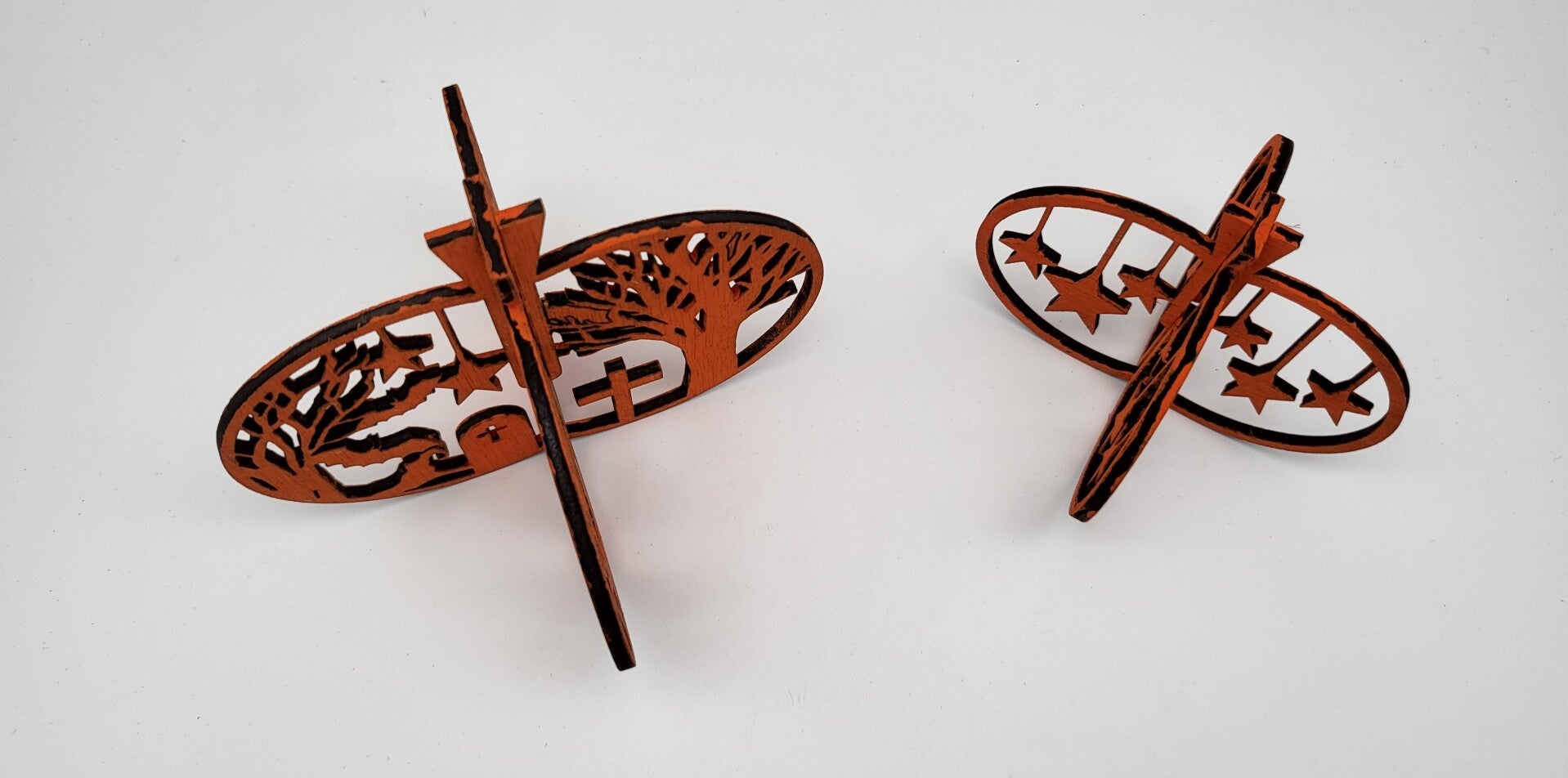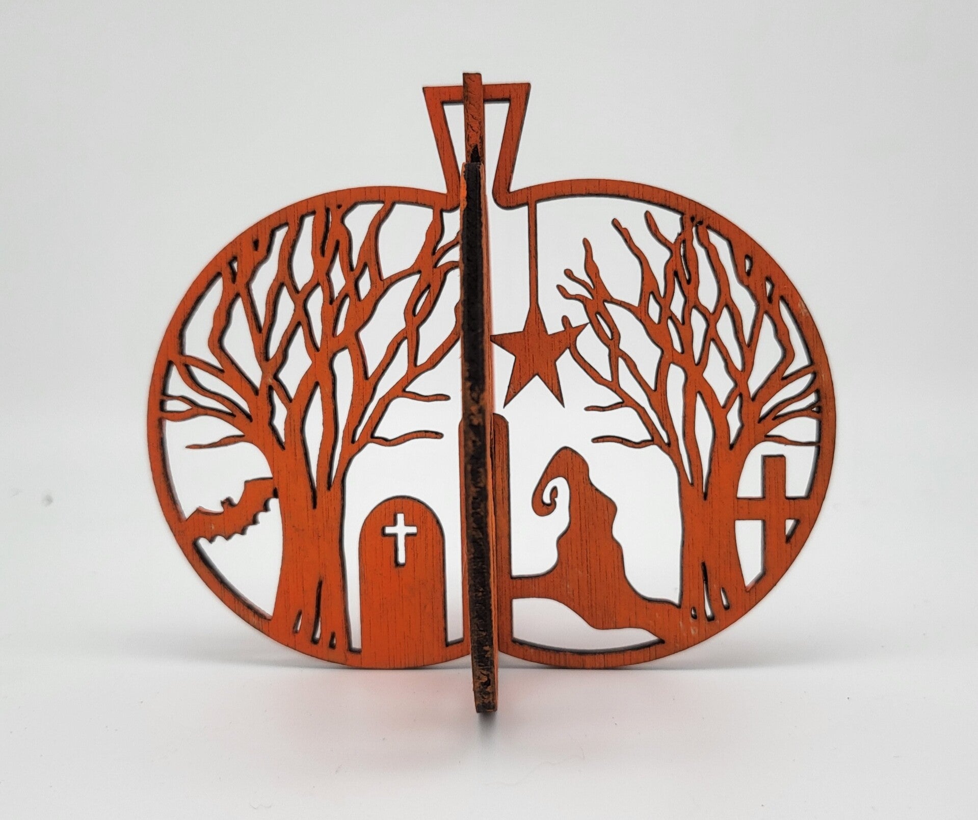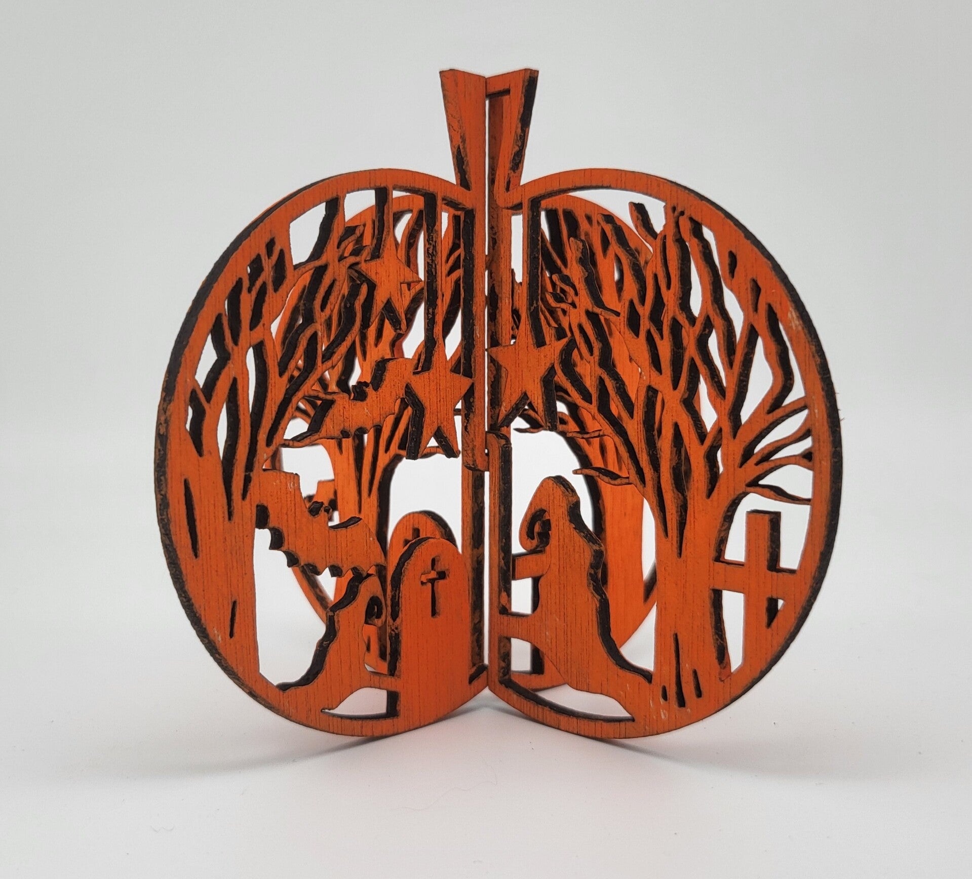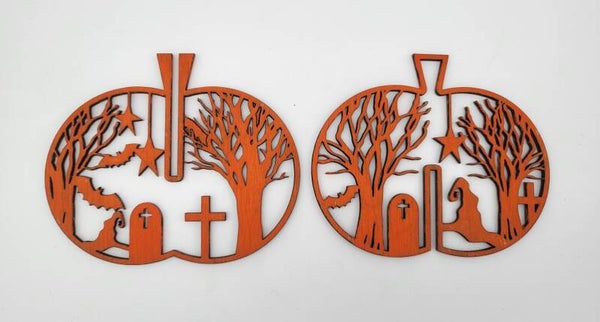 Pompoenen. Verschillende afmetingen en patronen. Kunnen met "visdraad" opgehangen worden of kunnen dienen als tafelversiering. Worden verstuurd in twee helften; klant moet de helften terug in elkaar schuiven.
