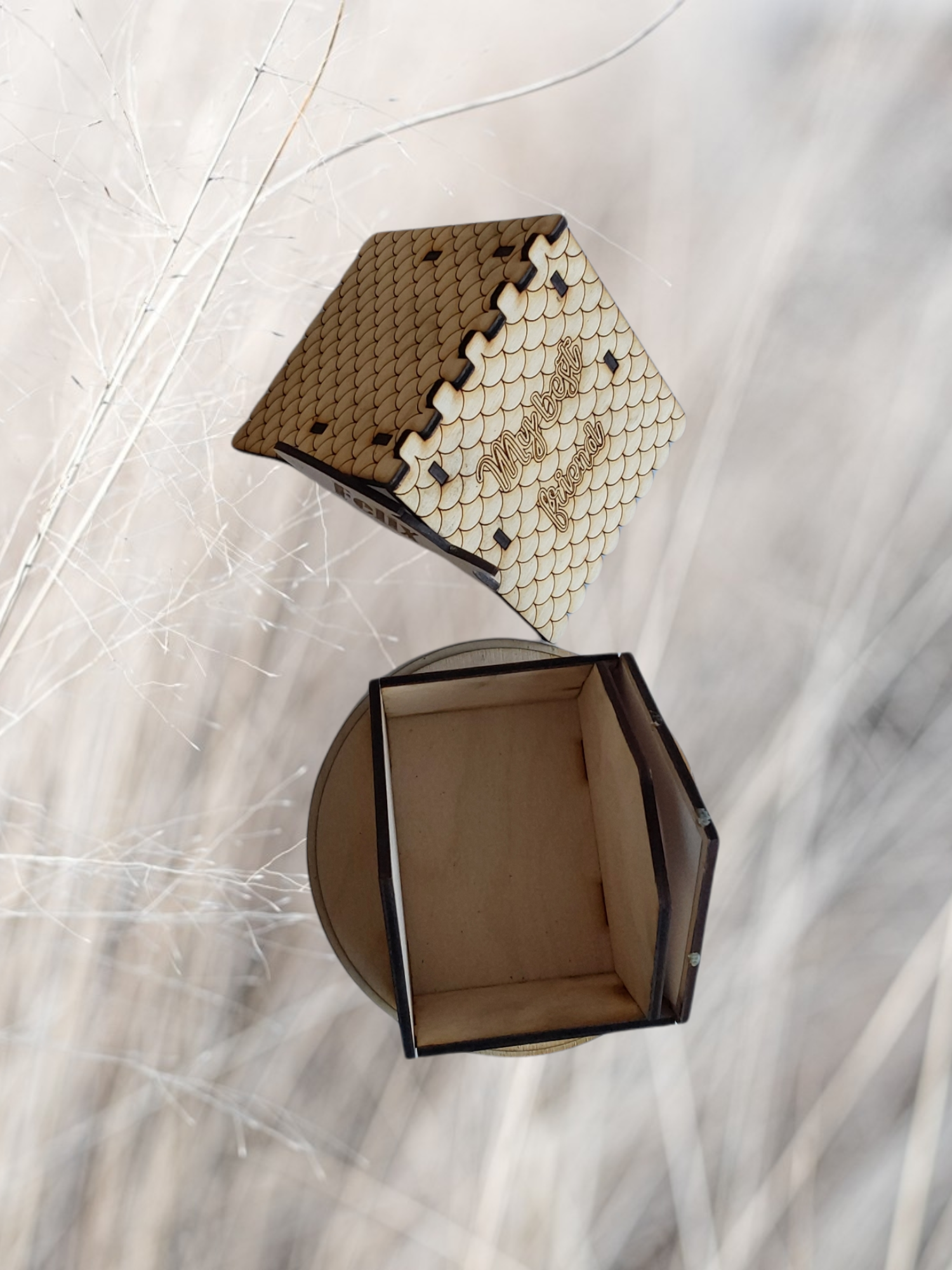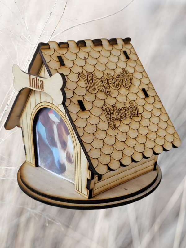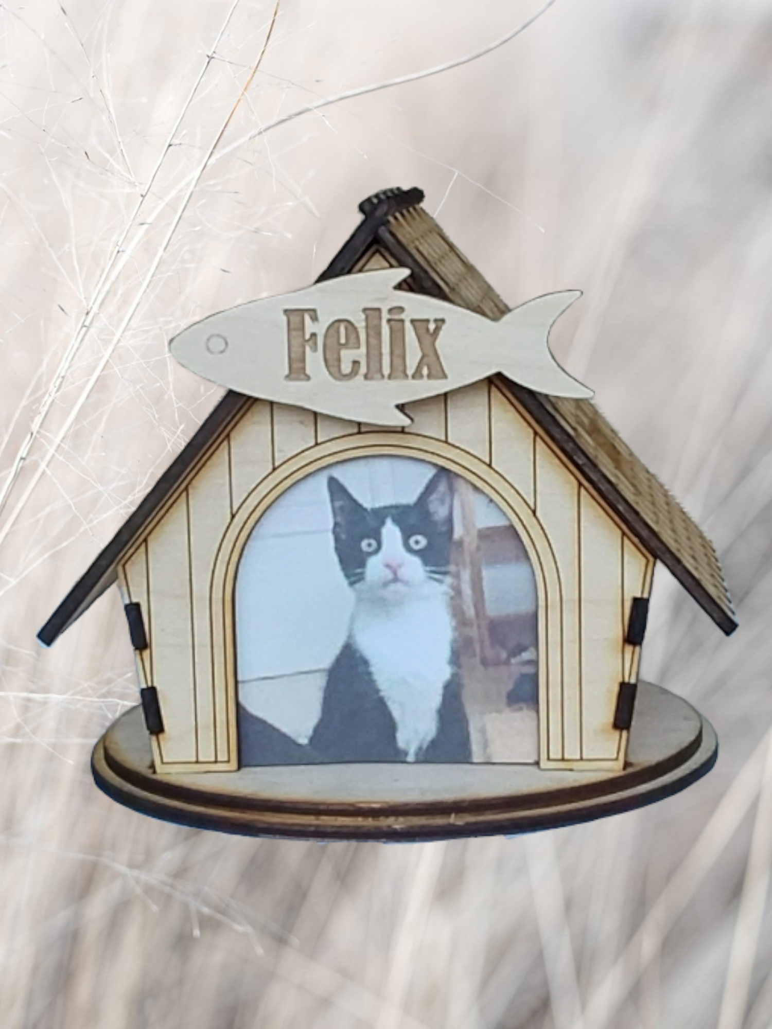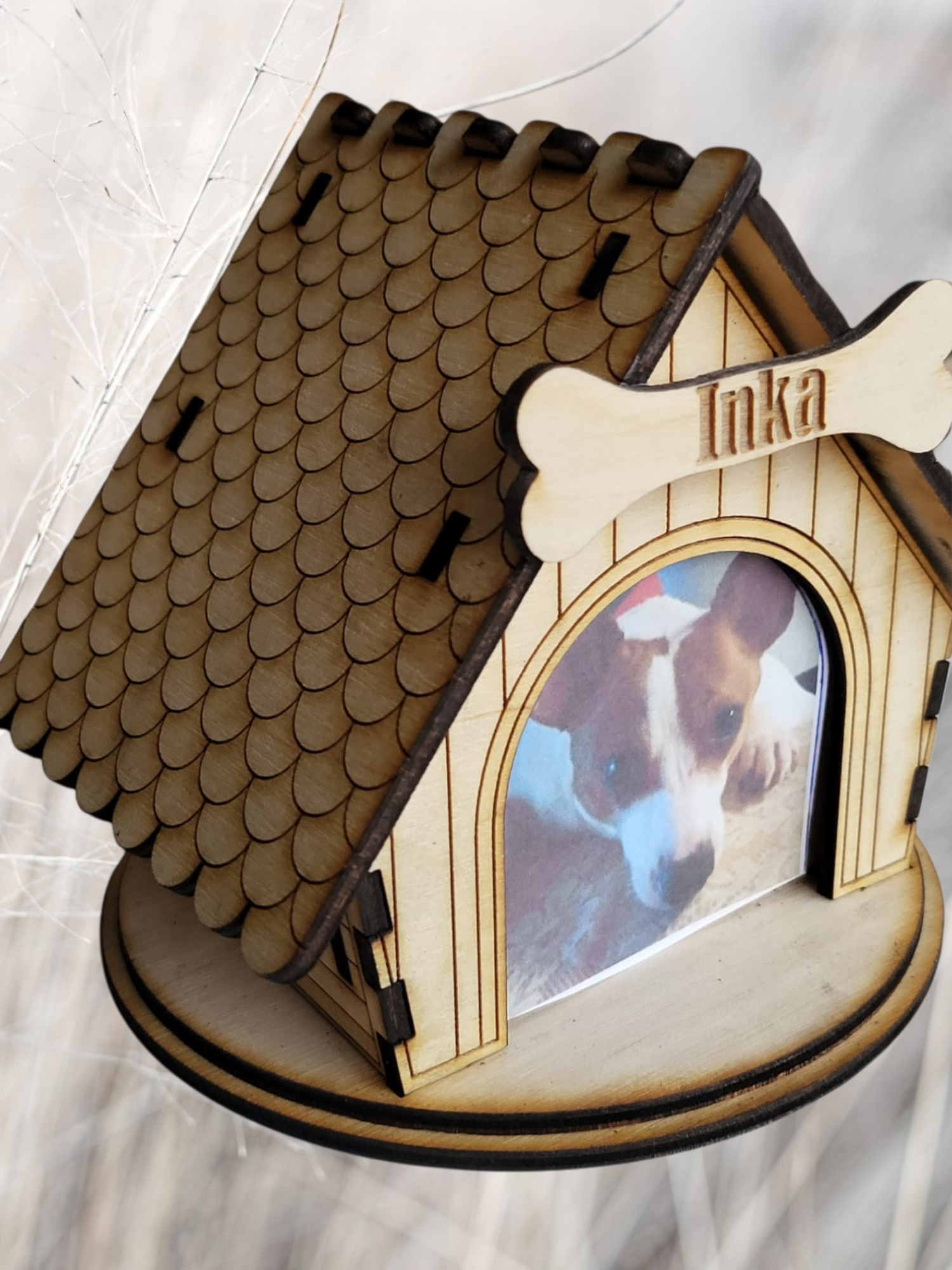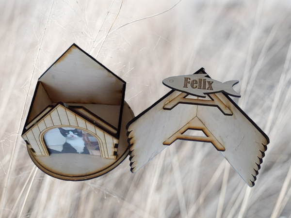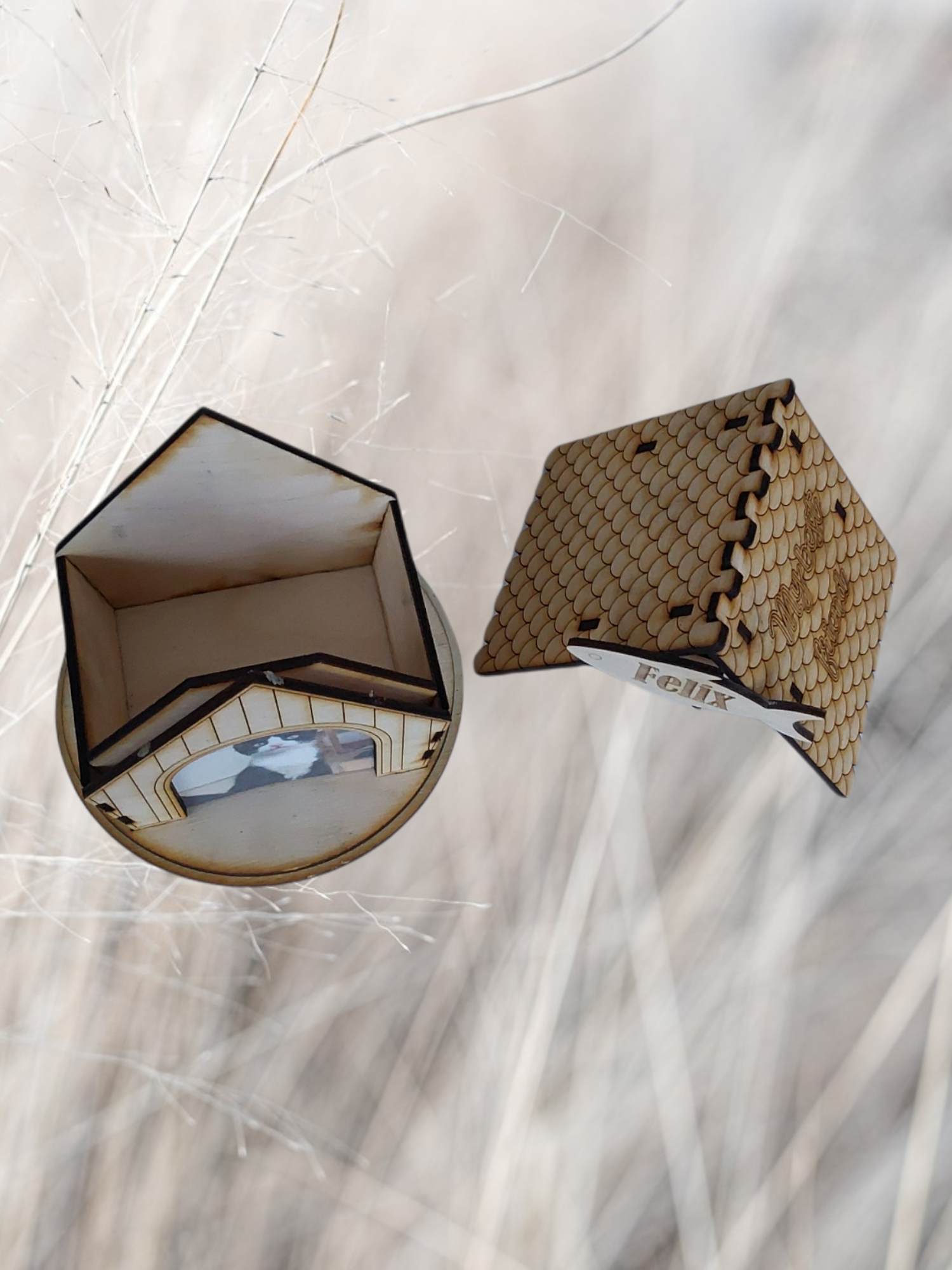 Gedenkhuisje voor hond, kat of mens: Je kan het doosje vullen met persoonlijke spulletjes wanneer je het dak optilt. Eveneens met een open dak kan je een fysieke foto toevoegen door de foto in het gleufje te steken. Je kan de foto ook laten laseren in het deurtje.