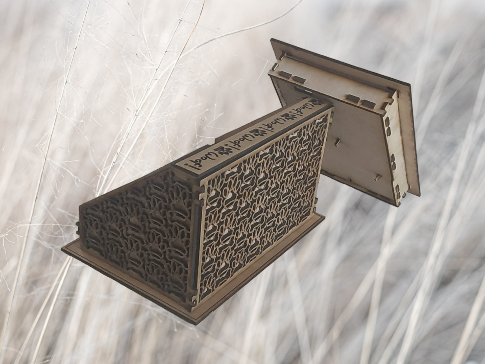 De basis van deze urne is dezelfde: een rechthoekige, liggende en aflopende doos met afneembaar deksel. Het deksel is hol en wordt afgesloten met een plexiglazen plaatje.