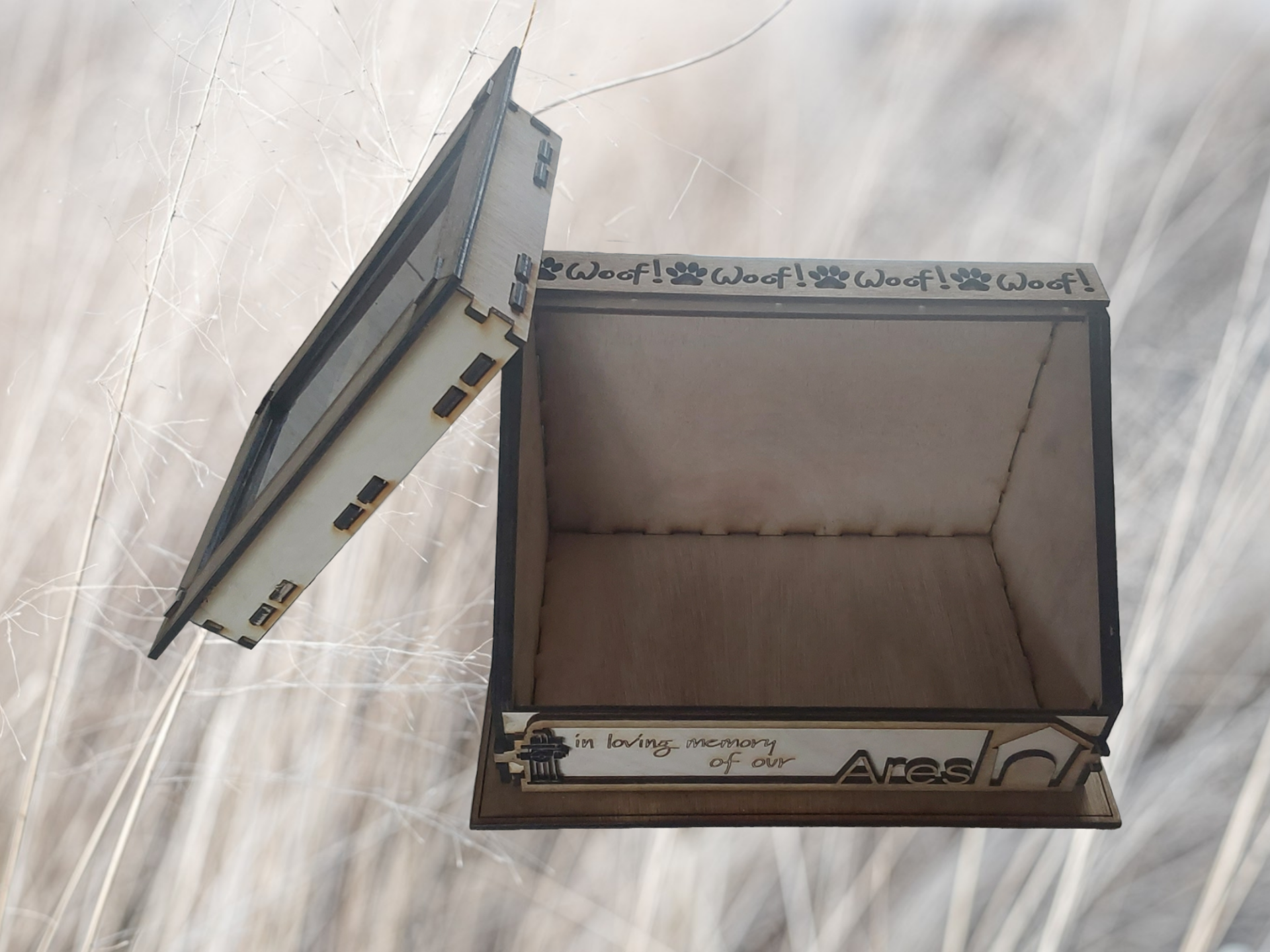 De bovenkant van de urne heeft een vast insnijding, namelijk een hondenpootje afgewisseld door het woord "woof" of een kattenpootje met het woord "meow".