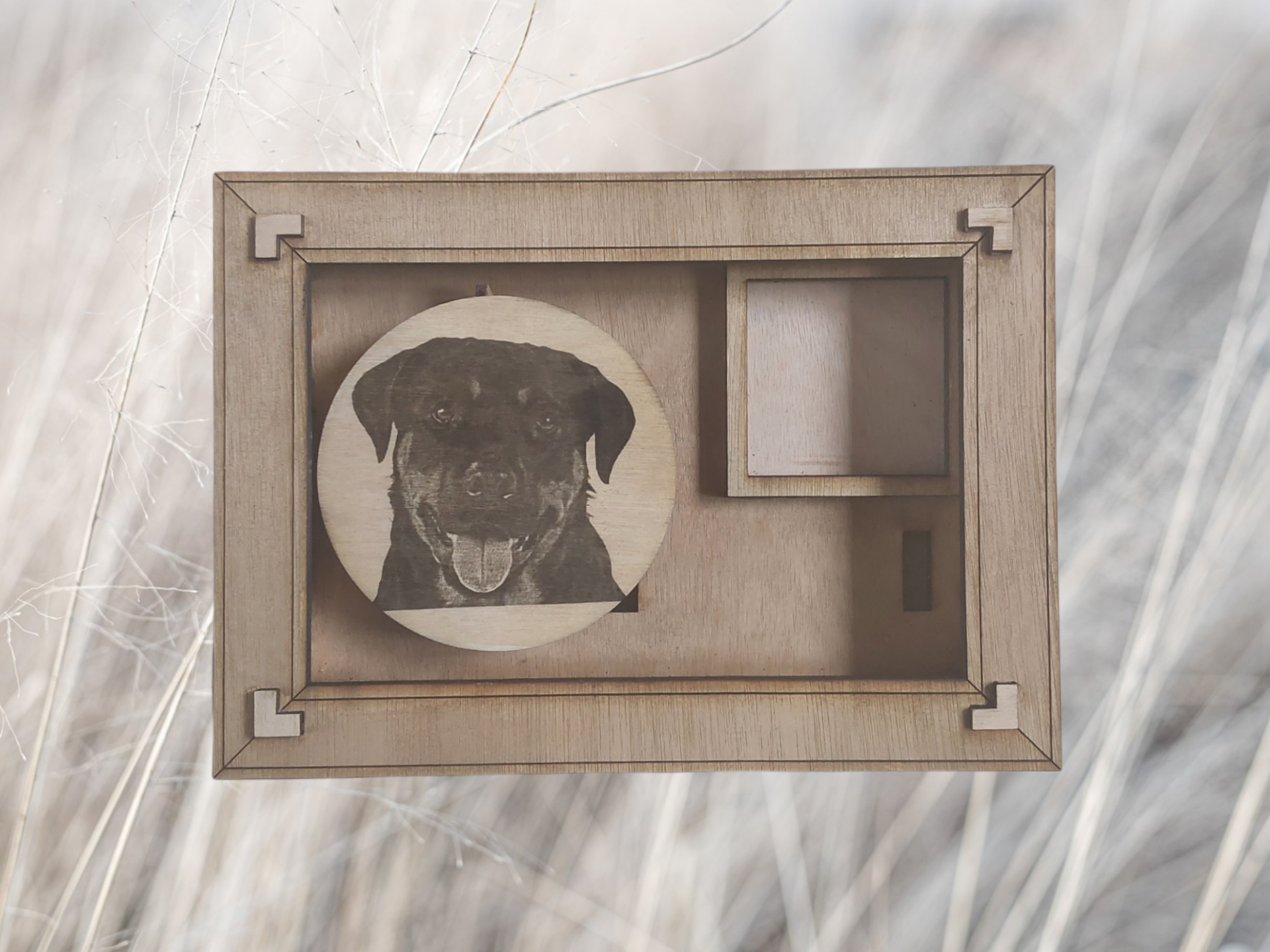 Op de houten ronde coaster kan een foto van je huisdier gelaserd worden.